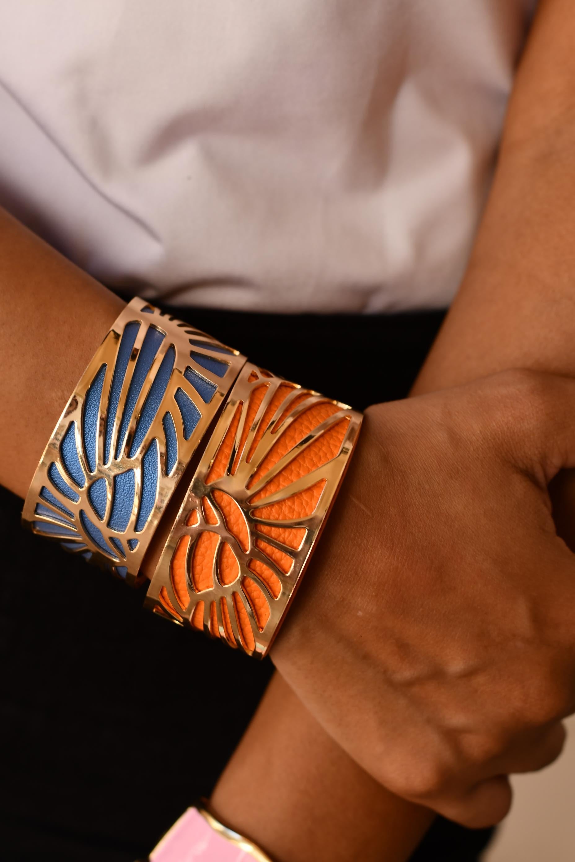 bracelet with leather color and stainless steel material free size orange or blue color